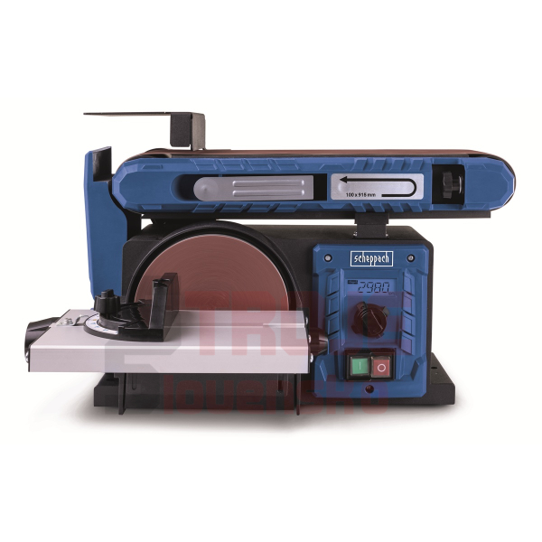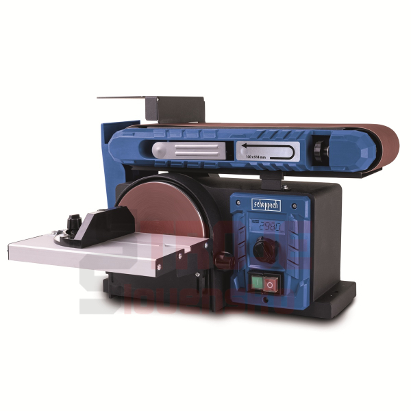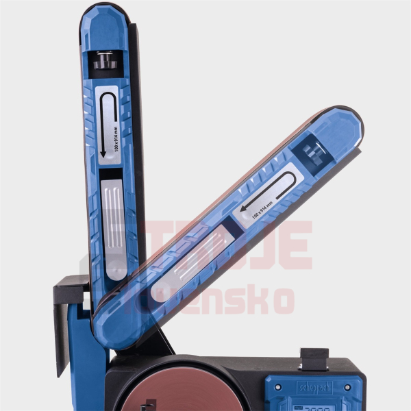 Stroj nabízí vysokou variabilitu – jednotku s brusným pásem lze naklápět v rozsahu 0–90°, tedy od horizontální do vertikální polohy. Přídavný pracovní stolek s úhlovým pravítkem je sklopný a lze jej zajistit mezi 0° a 45°. Na rozdíl od mnoha konkurenčních modelů je kotoučová bruska plně integrována do těla stroje, takže neomezuje prostor pro práci ani s většími obrobky. Brusný papír se na kotouč upevňuje snadno pomocí suchého zipu.