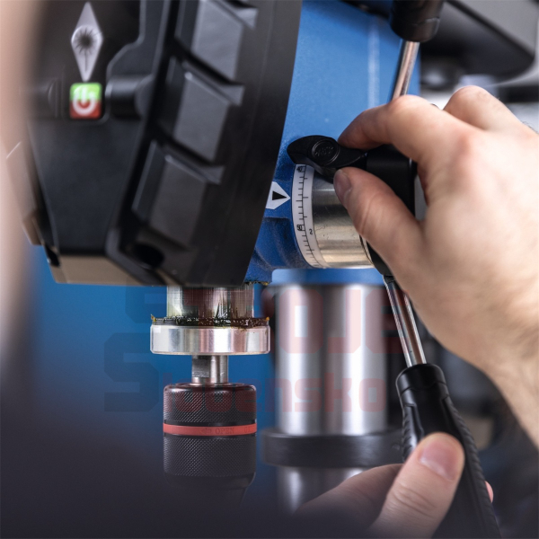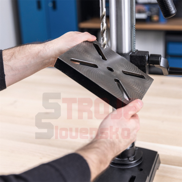 Masivní litinová konstrukce se sloupem o průměru 59,5 mm zajišťuje maximální stabilitu při práci. Pracovní stůl o rozměrech 198 × 194 mm je otočný o 360°, výškově nastavitelný a lze jej naklopit až o ±45°, což umožňuje pohodlné vrtání i složitějších obrobků. Digitální displej navíc zobrazuje aktuální otáčky v reálném čase.