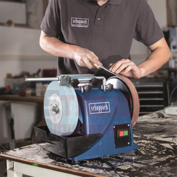 Brousicí systém Scheppach TiGer 2000s využívá princip mokrobroušení pomocí pomaloběžného brusného kotouče a koženého honovacího kotouče. Je ideální volbou jak pro domácí použití, tak i pro menší dílny či provozovny, kde je vyžadována vysoká přesnost ostření. Správné broušení nástrojů bývá náročné a každá chyba může vést k jejich poškození. Tento systém však díky vodicím pouzdrům pro jednotlivé typy nástrojů (nože, dláta, sekáče aj.) umožňuje dosáhnout profesionálních výsledků i úplným začátečníkům. Vodicí pouzdra zajišťují správný úhel ostření a usnadňují práci.