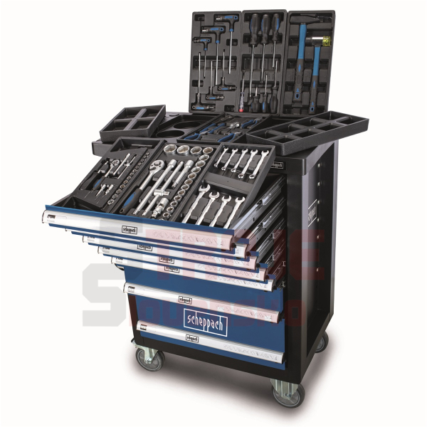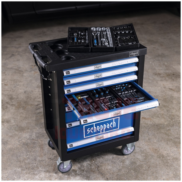 Dílenský vozík Scheppach TW1100 je všestranný pomocník do každé dílny i garáže. Robustní kovový rám zajišťuje vysokou odolnost a dlouhou životnost, zatímco čtyři velká, lehce otočná kola umožňují snadné přesouvání vozíku po dílně. Zásuvky lze uzamknout, takže je přiložená 70dílná sada nářadí vždy bezpečně uložena. Díky nosnosti až 450 kg můžete horní plochu vozíku bez obav využít i jako pracovní odkládací plochu pro těžší díly a nástroje.