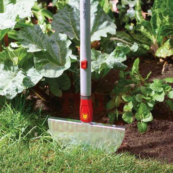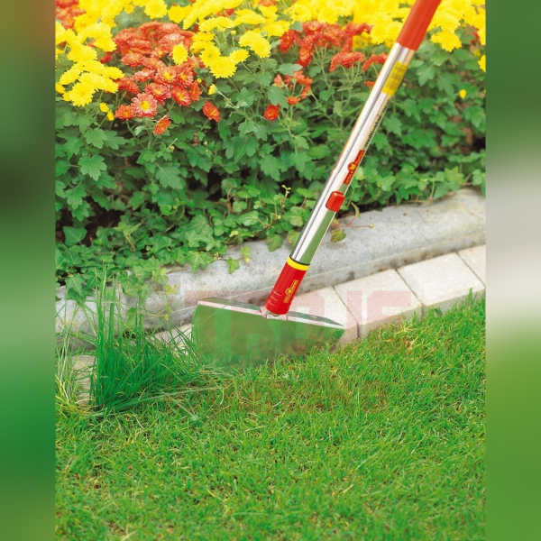 Ostrý tvrzený nůž čistě odřezává převislou trávu na hranách trávníku